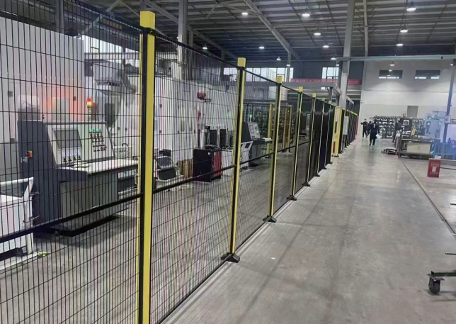Automated workshop: The robot work zone and automated production line are isolated to prevent accidental equipment contact and ensure operational safety.